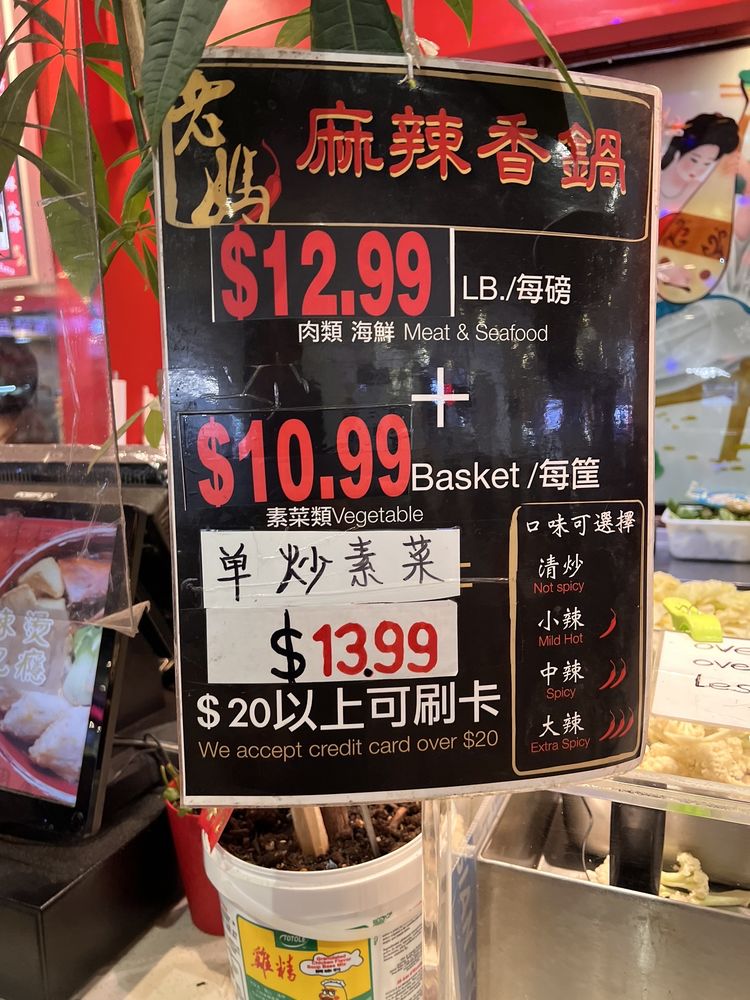 “ The best spot for dry hotpot. Whenever I'm craving dry hotpot, I have to get it from here. It's located inside the food court of New World Mall, which is already such a busy spot since it has some of the most affordable food and portion sizes. There's a ton of tables but it's also always packed so you'll have to be quick to snag a table. I've been coming to LaoMa MaLaTang for years now and they've never disappointed. You pick what you want from the meat & seafood selection, which is then weighed and charged by the weight. And then you can also add a basket of vegetables (as many of your choosing) for a set price. Of course prices have gone up over the years, given inflation and all, but the price to portion ratio is so worth it and definitely much more worth it than the other restaurants in NYC that offer this. The variety is also much greater. After picking everything, you choose a spice level and they cook it up in the back. The amount your order is also determines the bowls of rice you get. Trust me, the plain rice is the perfect compliment to the flavors and spices from your bowl. One of my favorite ingredients to get is fish cause they fry it perfectly and then add it in so it has a lovely crispy outer with a flakey interior while coated in the delicious mala spice. Other than the dry hotpot, the malatang is also really popular here. They have different topping options of the malatang to choose from and it's a soup rather than dry hotpot with a ton of ingredients in it as well. Those bowls go for ~$10 so definitely affordable and filling too! ”